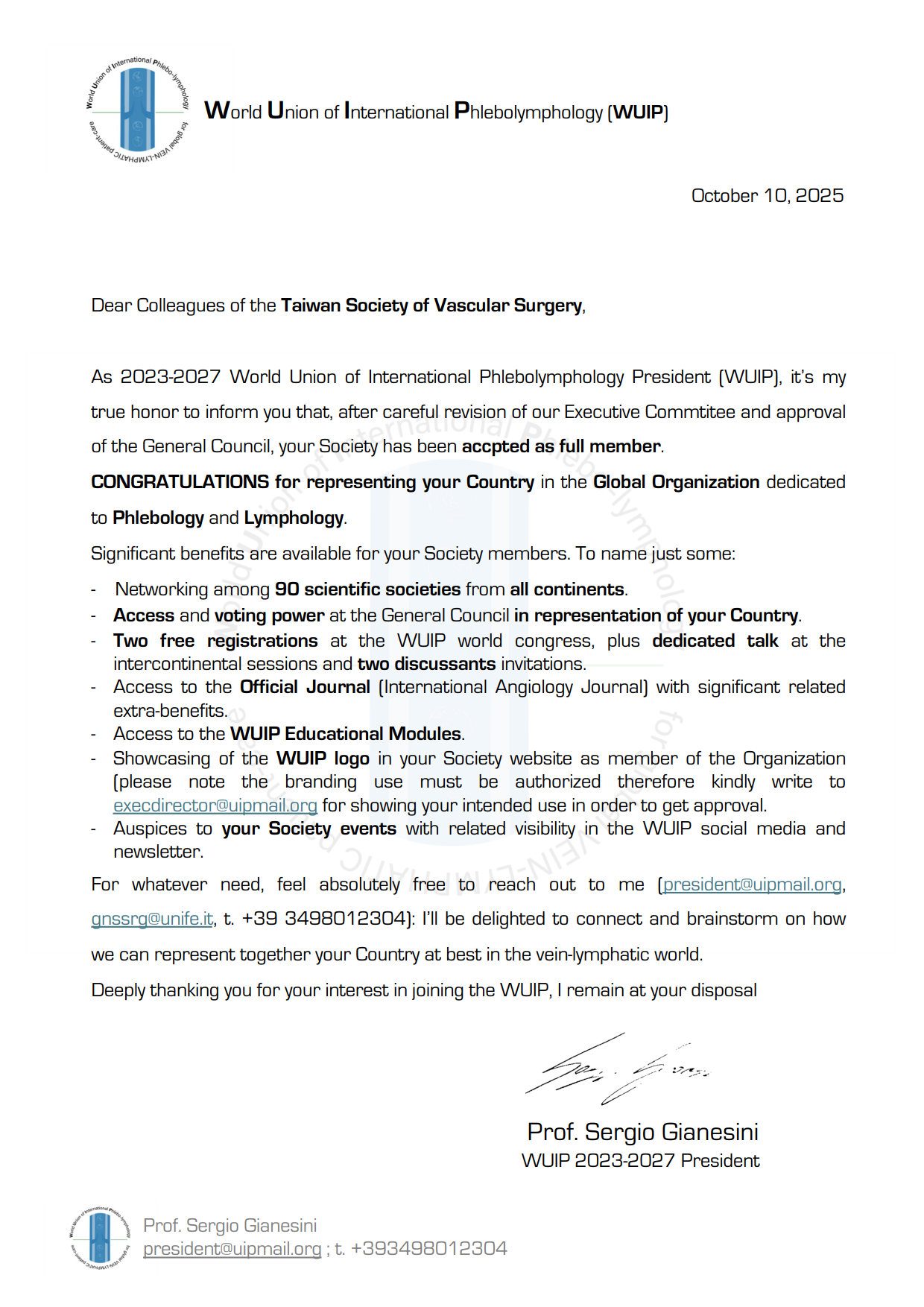 We are pleased to announce that the Taiwan Society for Vascular Surgery (TSVS) has been officially accepted as a member of the International Union of Phlebology(UIP) — the World Federation of Phlebology.